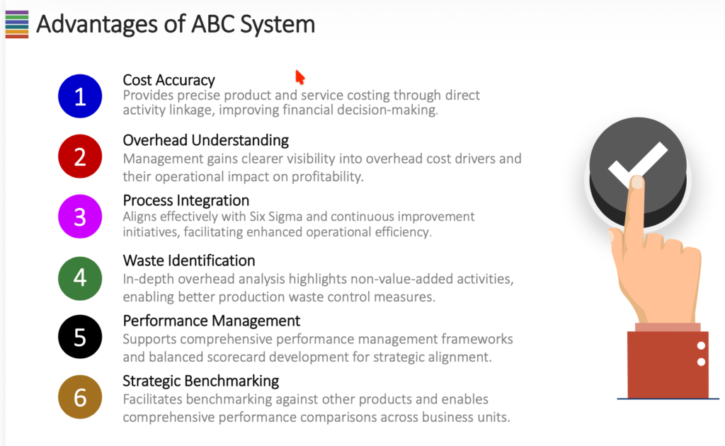 1. Cost Accuracy (Độ chính xác chi phí): Cung cấp giá thành sản phẩm và dịch vụ chính xác thông qua liên kết trực tiếp với hoạt động, cải thiện chất lượng ra quyết định tài chính – đây là ưu điểm cốt lõi và là lý do ABC được phát triển.